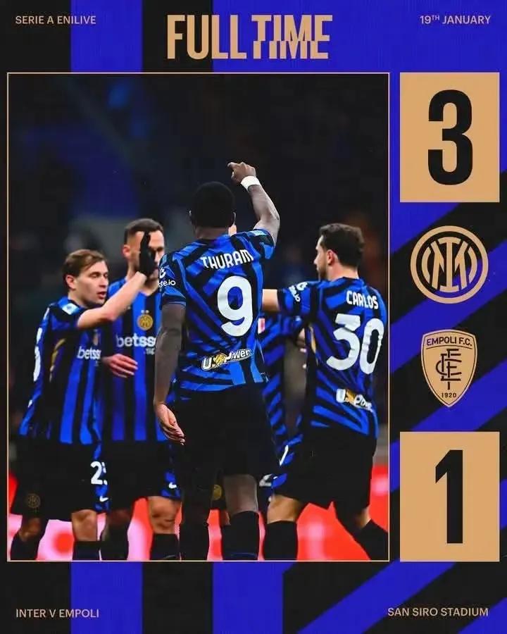 国米在凌晨进行的比赛中迎战恩波利,最终以3:1的比分取得胜利。尽管比分只有1球差距,但4粒进球全都是国米球员打入的,其中劳塔罗更是连续两轮破门,成为队伍的最大功臣之一。